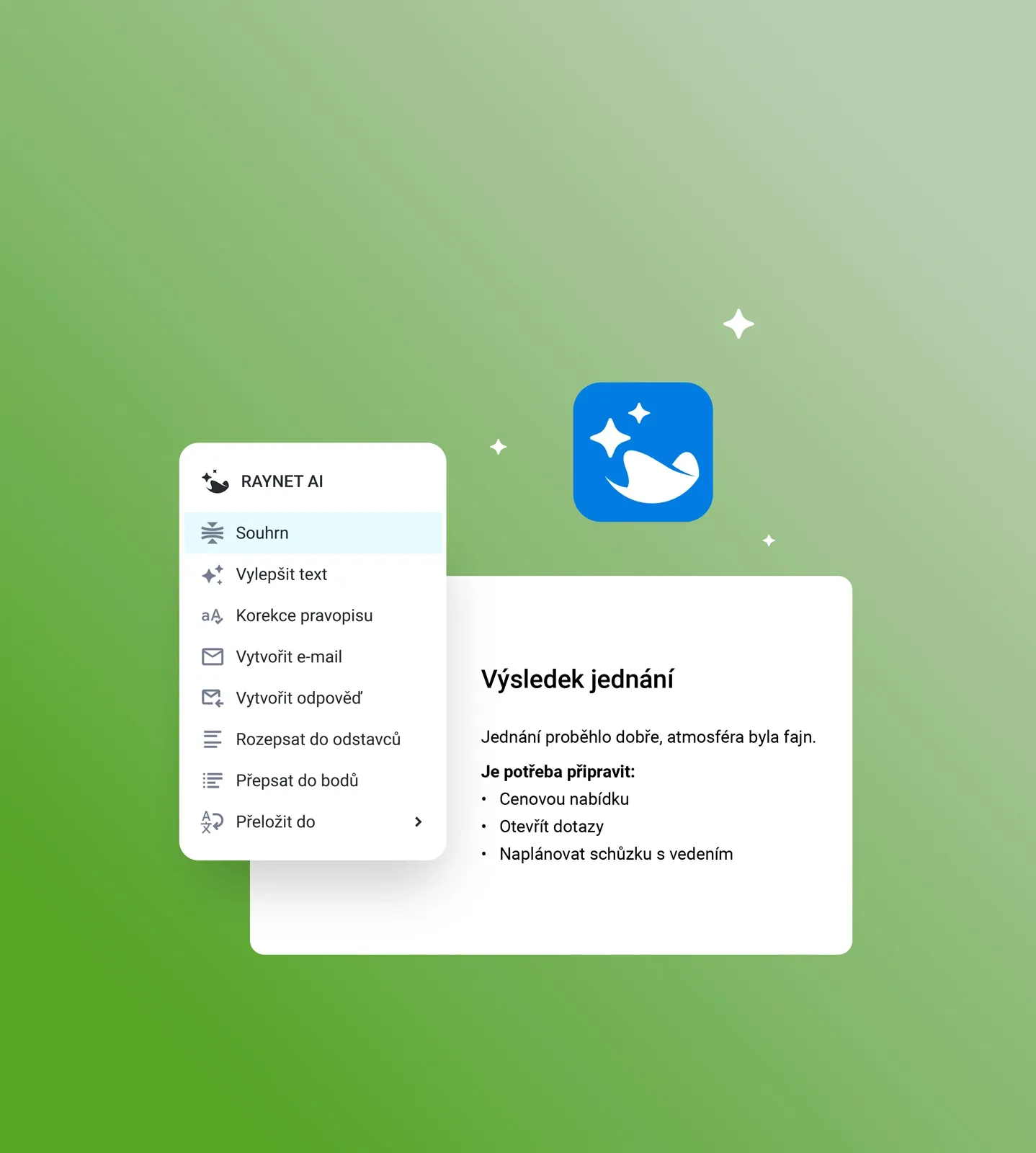 Kouzelným tlačítkem proměníte své poznámky z CRM přesně v to, co zrovna potřebujete. E-mail, souhrn nebo třeba překlad. Bez překlikávání do jiných nástrojů a bez vypisování promptů.